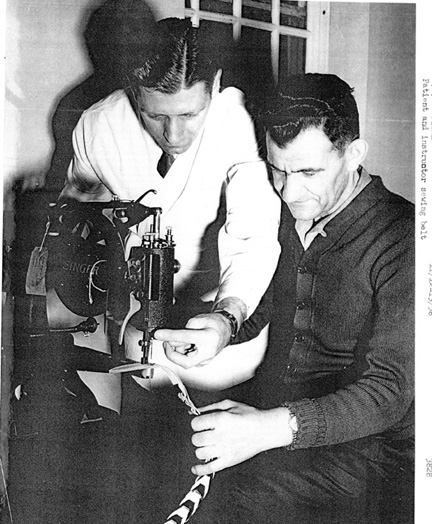 Kokal showing patient Joseph Gerycz how to use a stitching machine to sew a leather loop belt.